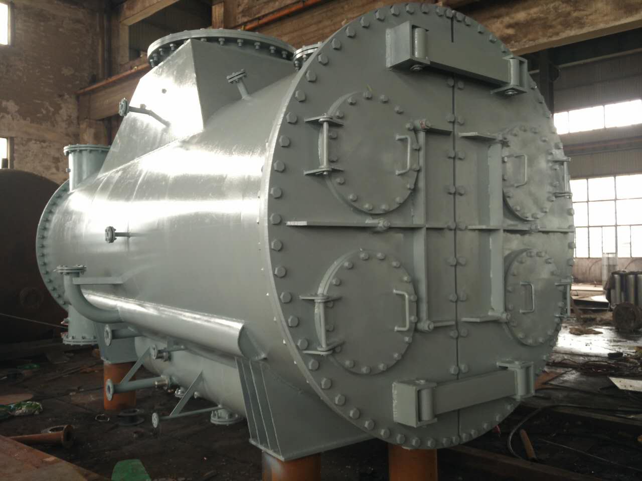 雙背壓凝汽器工作過程:凝汽器正工作時,冷卻水由低壓側的兩個進水室進入,經過凝汽器低壓側殼體內冷卻水管,流入低壓側另外兩個水室,經循環水連通管水平轉向后進入壓側的